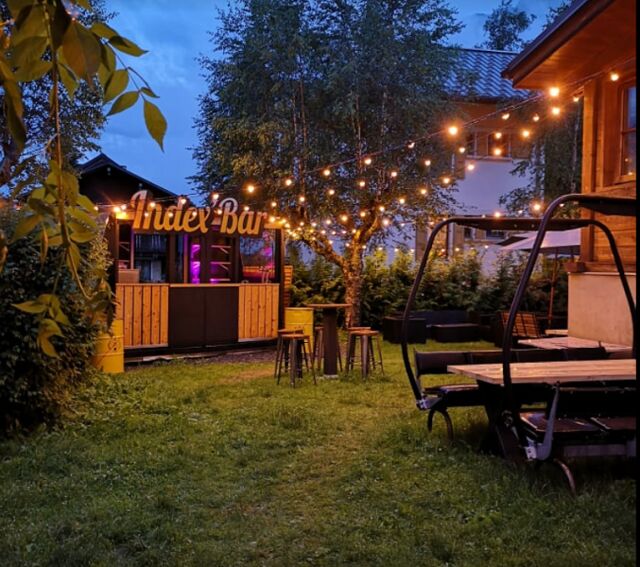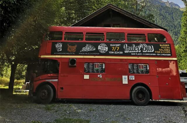 Installé à la frasse, l'INDEX'BUS dispose d'une grande terrasse avec vue sur le Mont Blanc et de nombreuses places de parking.